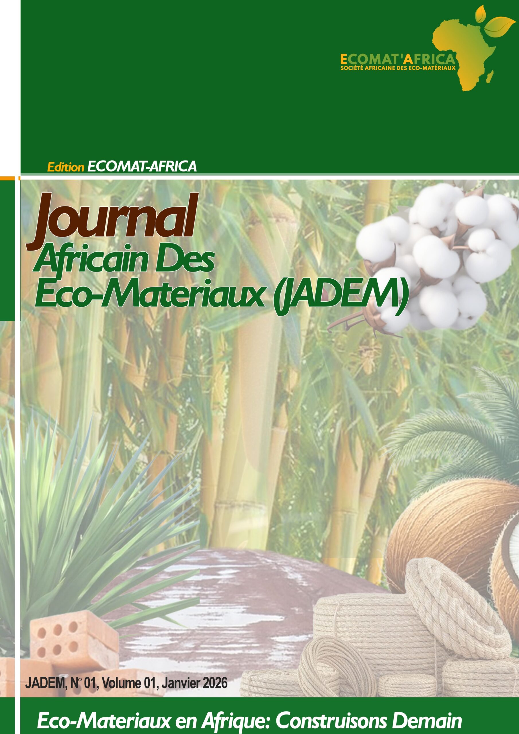 Le JADEM est un journal trimestriel qui propose la Publication d’articles scientifiques sur la Valorisation des éco-matériaux en Afrique en intégrant une démarche multidisciplinaire et multi-sectorielle et couvrant un large de domaine :
